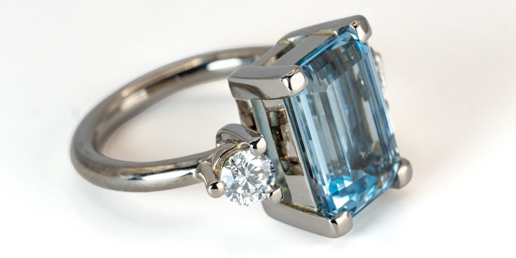 Aquamarin-Ringvon Elkein Ringe, Unikatschmuckan Veröffentlicht am Januar 15, 2024Januar 15, 2024 Auftragsarbeit, Ring Weißgold 750/- mit Aquamarin „Santa Maria“ (4,67 ct) und zwei Brillanten (zusammen 0,61 ct)