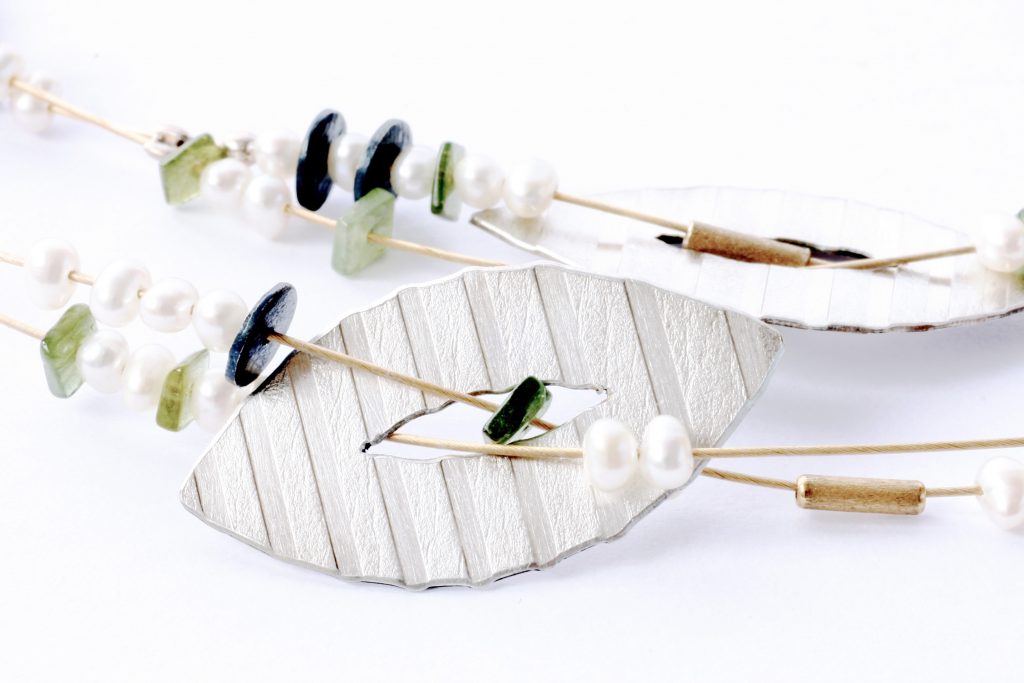 Geprägte „Blätter“ aus Silber 925/- mit Turmalin, Süßwasserzuchtperlen und Zwischenteilen aus Gelbgold 750/- auf vergoldetem Stahlseil.